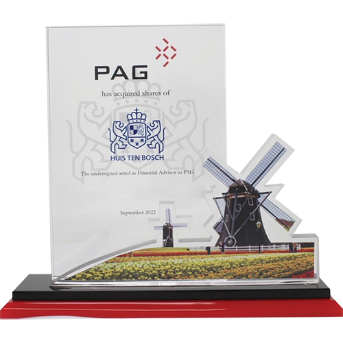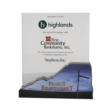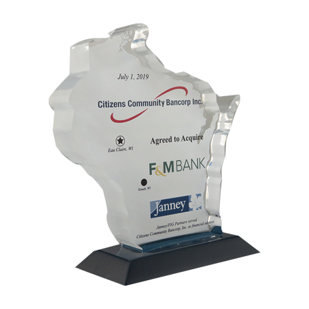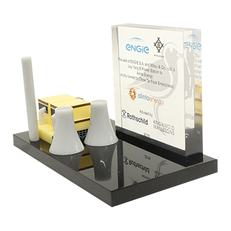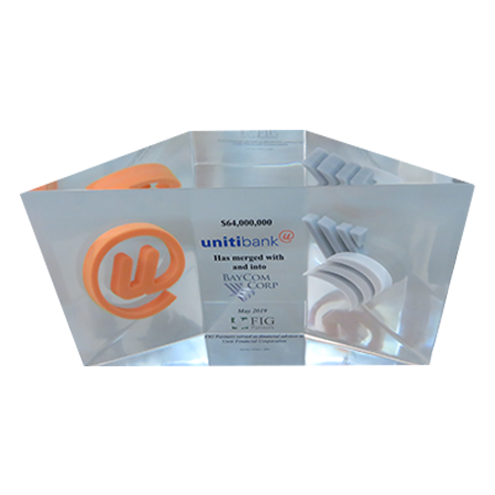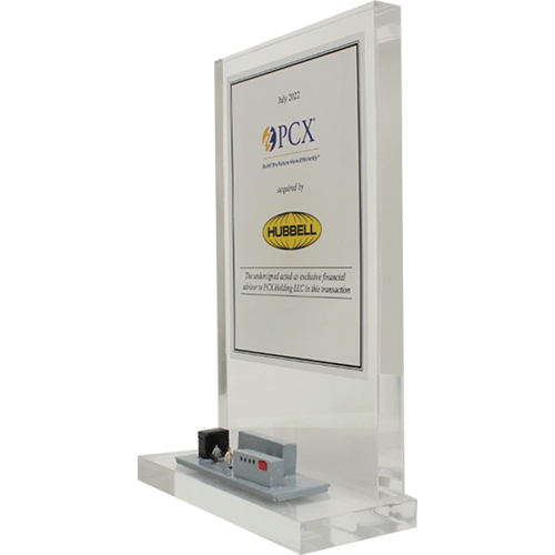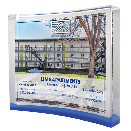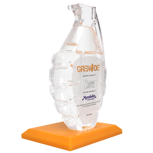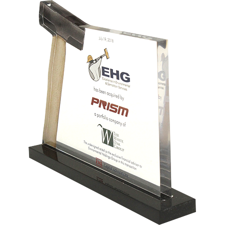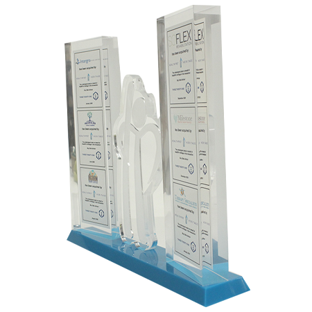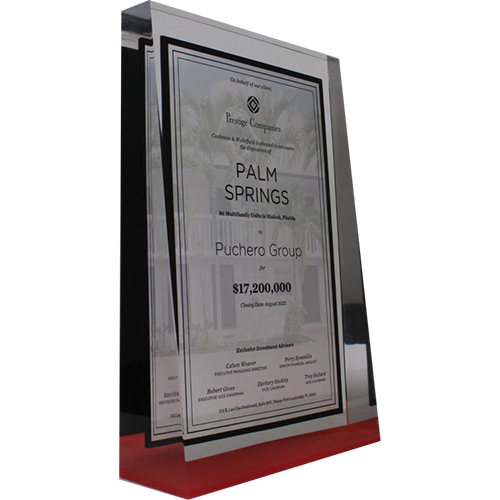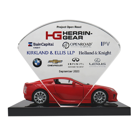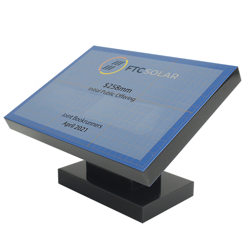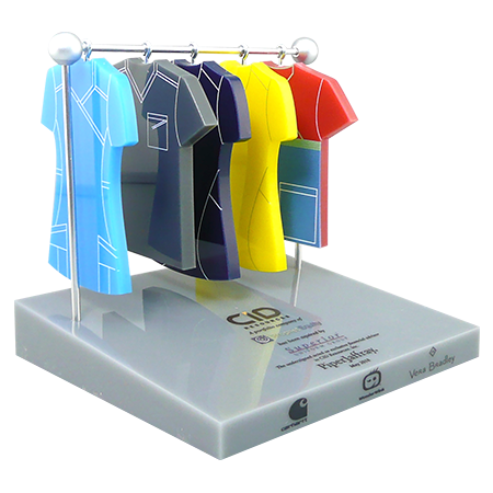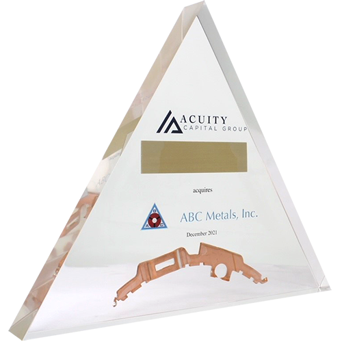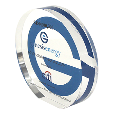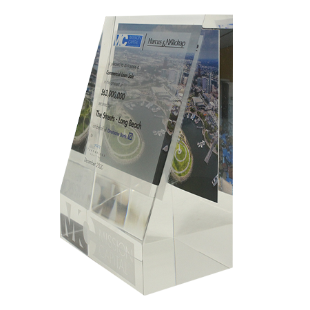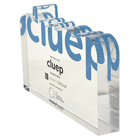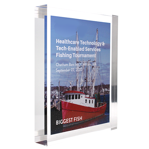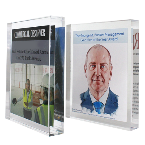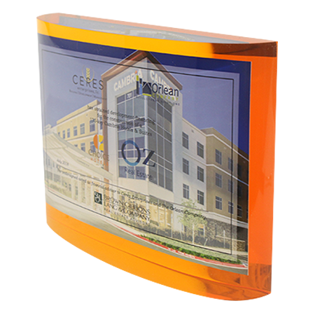 Acrylic/Lucite is a transparent plastic material with outstanding strength, stiffness, and optical clarity. Allows items to be embedded/suspended in the middle of the shape. Custom colors can be added to the acrylic to match specific images or brands. Customization in acrylic is limitless.